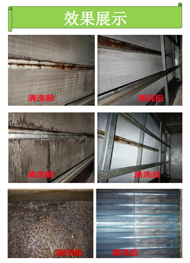 使用方法:使用原液和水按照1:2比例稀释,用喷壶均匀喷晒翅片表面,反应3-5分钟后,用高压水冲洗干净。